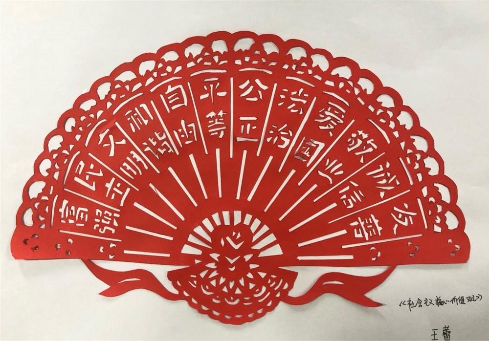 園區(qū)投資公司王蕾的作品《社會主義核心價值觀》獲得二等獎,作者以緊密有致的扇形設(shè)計將社會主義核心價值觀這個主題巧妙的呈現(xiàn),作品畫面均衡、線條流暢,美觀大方,有較高的藝術(shù)性和觀賞性。