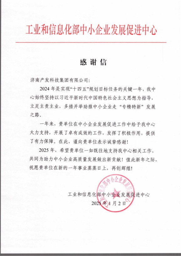 近日,濟(jì)南產(chǎn)發(fā)科技集團(tuán)有限公司(以下簡稱“科技集團(tuán)”)收到一封來自工業(yè)和信息化部中小企業(yè)發(fā)展促進(jìn)中心(以下簡稱“促進(jìn)中心”)的感謝信,信中對科技集團(tuán)在2024年中小企業(yè)發(fā)展促進(jìn)工作中發(fā)揮積極作用、提供有力保障表示由衷感謝。